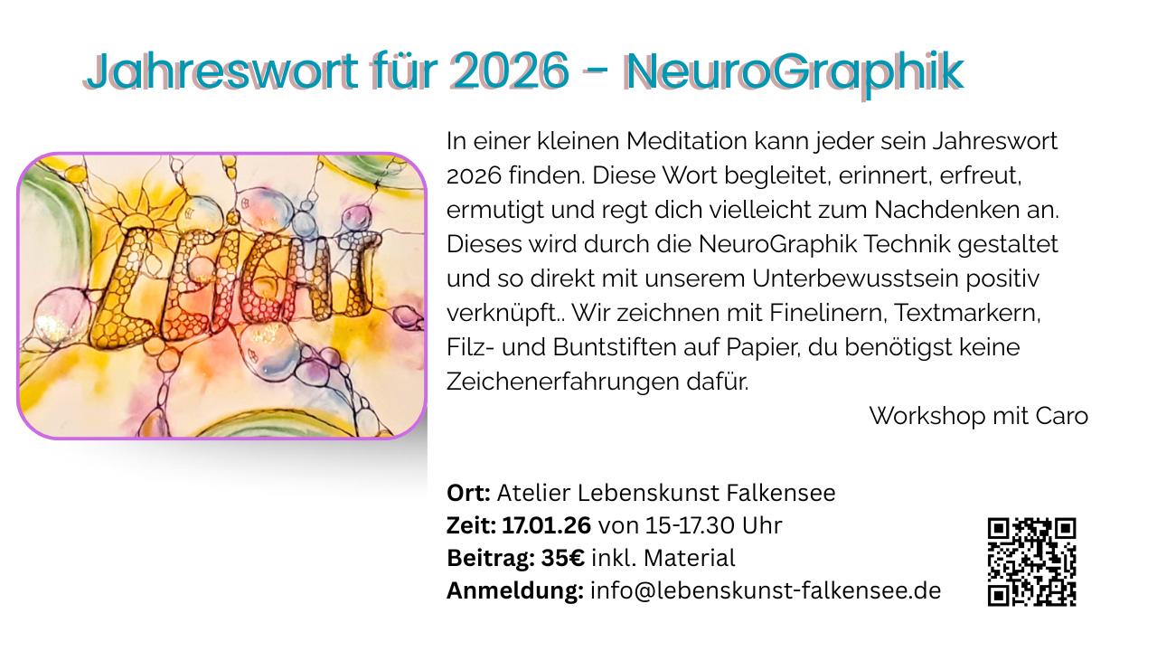 "Bei Caro habe ich zum ersten Mal Neurographik probiert und mein Wort des Jahres gemalt. Die Anleitung war Schritt für Schritt und auch in dem (energetischen) Raum habe ich mich sehr wohl gefühlt. Ich konnte mich zum einen in mein Bild vertiefen und aber auch Fragen stellen. Alles war so wunderbar vorbereitet und ich danke sehr für die Erfahrung. Gerne mache ich das öfter. Danke liebe Caro!"
